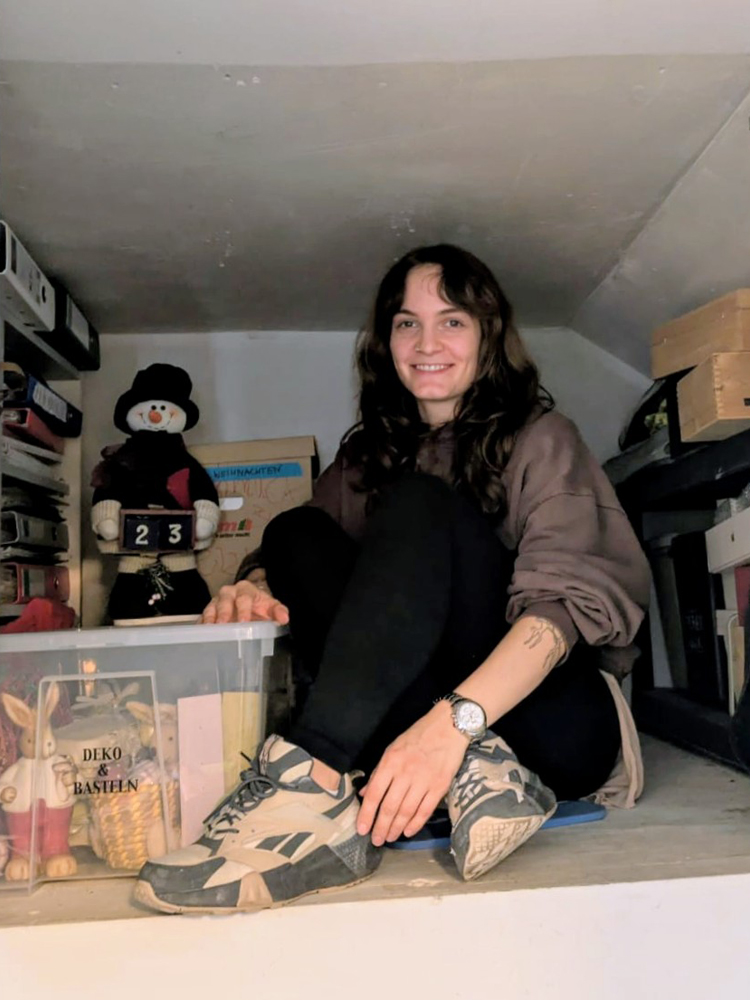Bildbeschreibung-Agent sagte: Frau sitzt in kleinem Dachbodenraum neben Kiste mit Aufschrift „Deko & Basteln“ und einem Schneemann-Dekofigur.